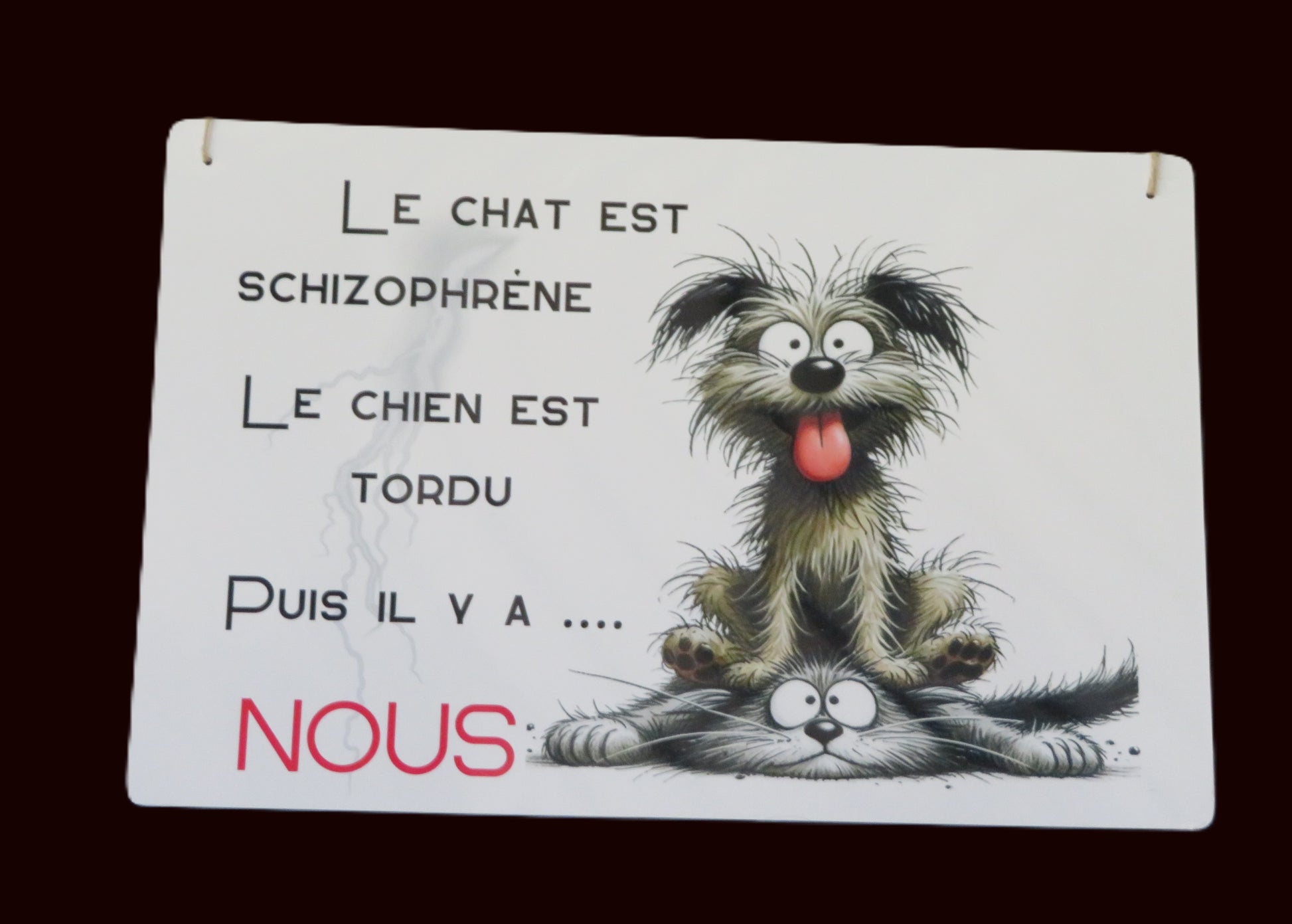 Panneau déco "Le chat est schizophrène, le chien est tordu ... puis il y a NOUS"