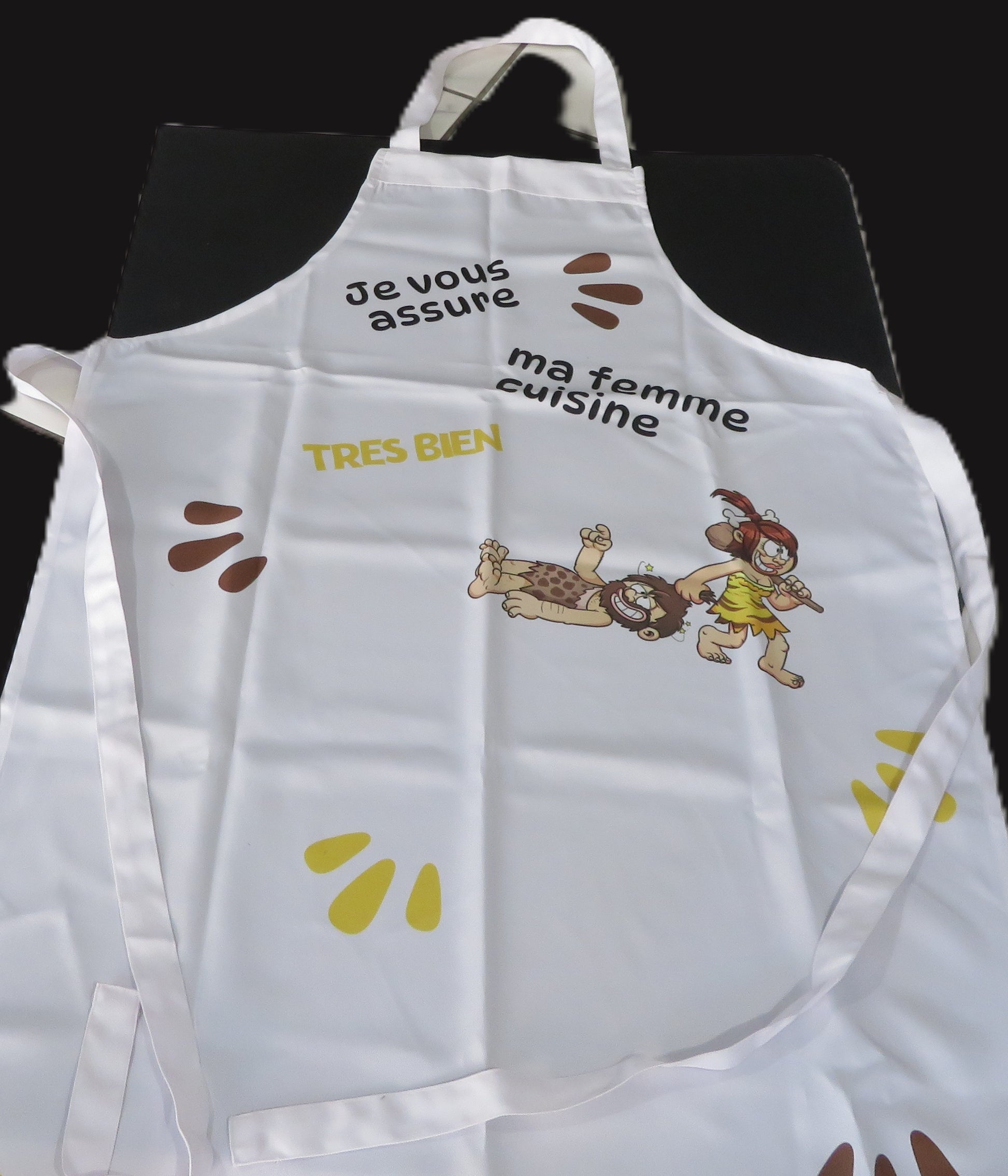 Ce tablier met les pieds dans le plat avec son message percutant et son illustration façon homme des cavernes KO après un plat ... inoubliable !
